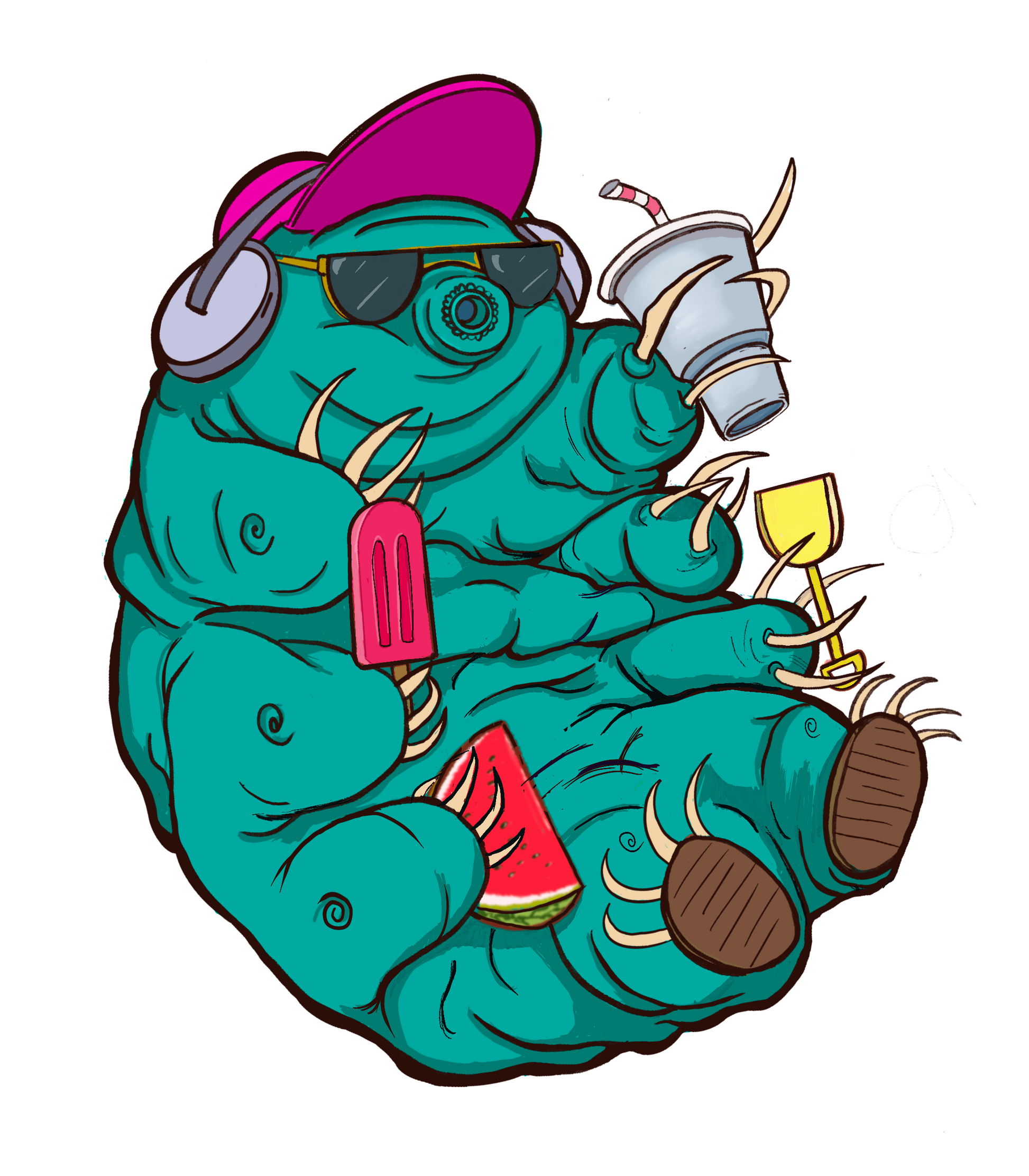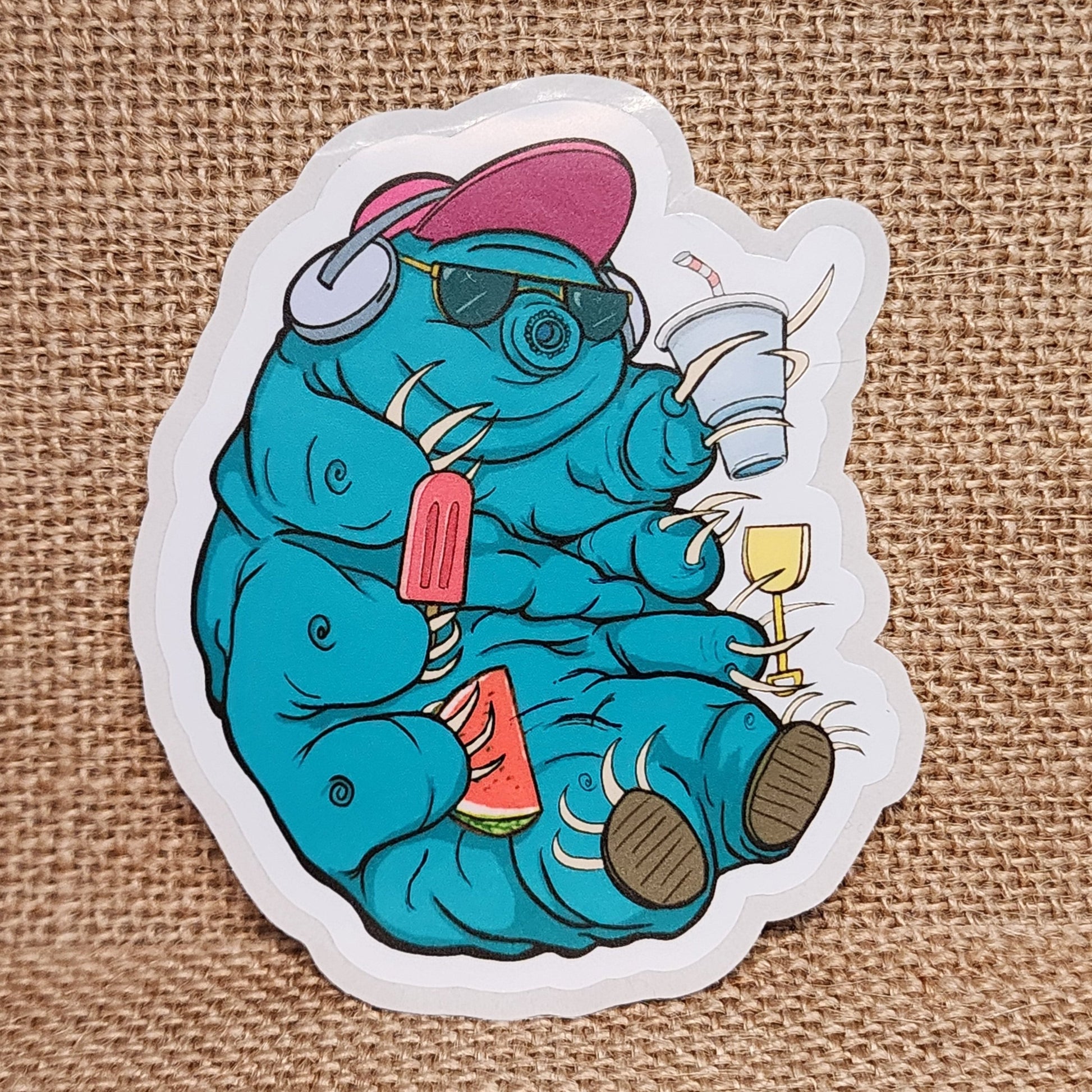 Get ready to hit the beach with the most festive vacationer around—a laid-back tardigrade! Sporting tiny sunglasses and a tropical drink in hand, this adorable 'water bear' knows how to chill in style. With a big smile and an unstoppable party vibe, who wouldn’t want to kick back in the sand with the universe’s cutest, toughest little creature?
