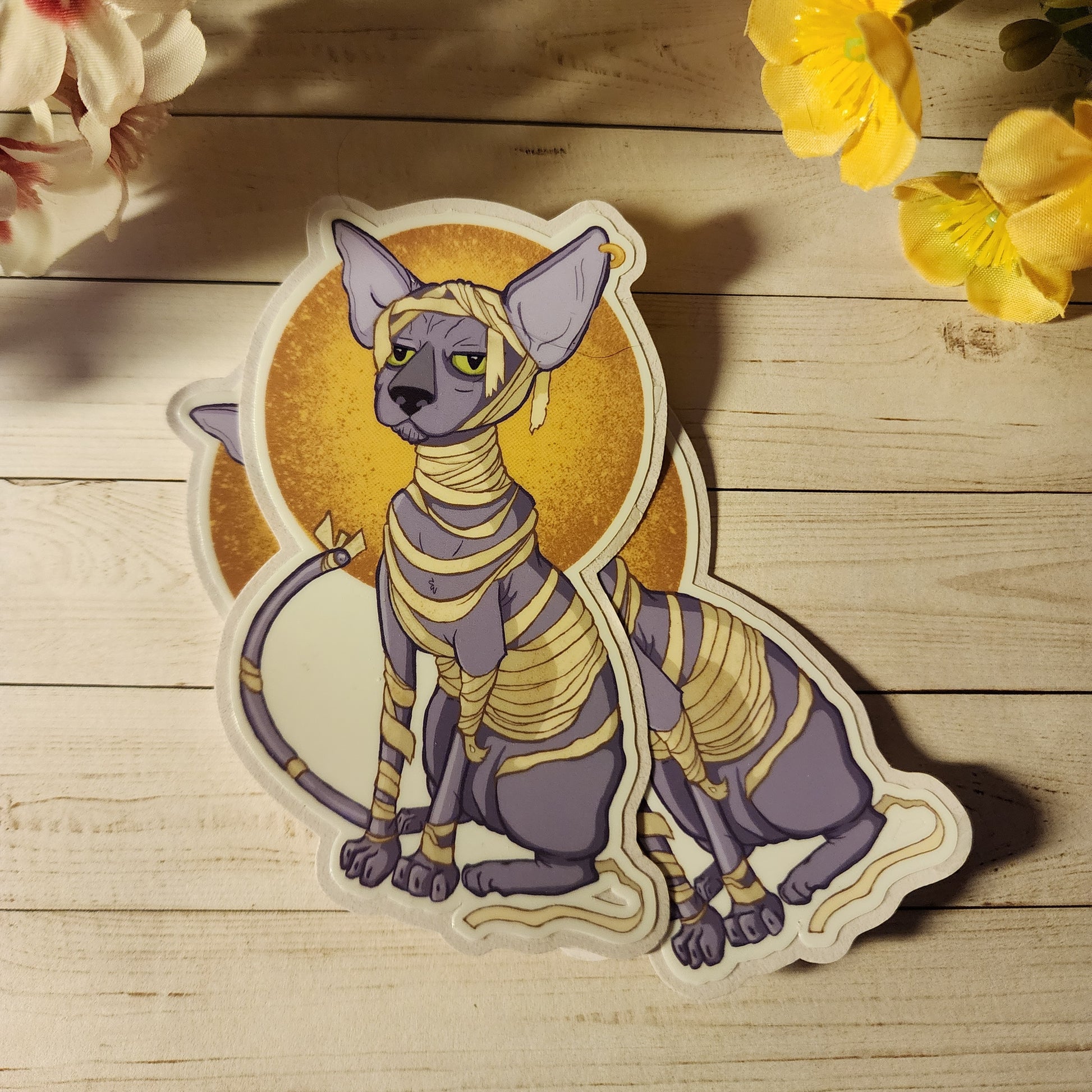 Meet Pharaoh Purrs—the ancient guardian of naps and mischievous meows! Wrapped in bandages but full of sass, this hairless cat mummy is ready to creep into your heart and onto your sticker collection, one spooky purr at a time.